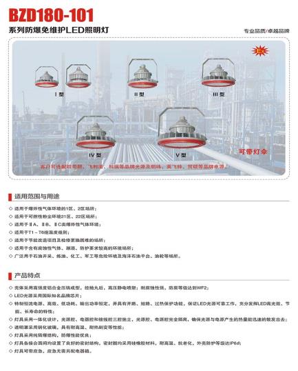 BZD180-101系列防爆免维护led照明灯,在防爆常用产品中,光源电器以防爆产品严格要求下,选用的LED光源采用国际知名品牌进口芯片,驱动采用宽压恒流电源,高效、低功耗、并具有开路、短路过温保护功能,保证LED光源正常工作,充分发挥LED高光效、节能、长寿命的特性; 壳体采用高强度铝合金压铸成型,经抛丸后、高压静电喷塑,耐腐蚀性强,防腐等级达到WF2